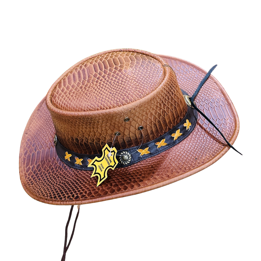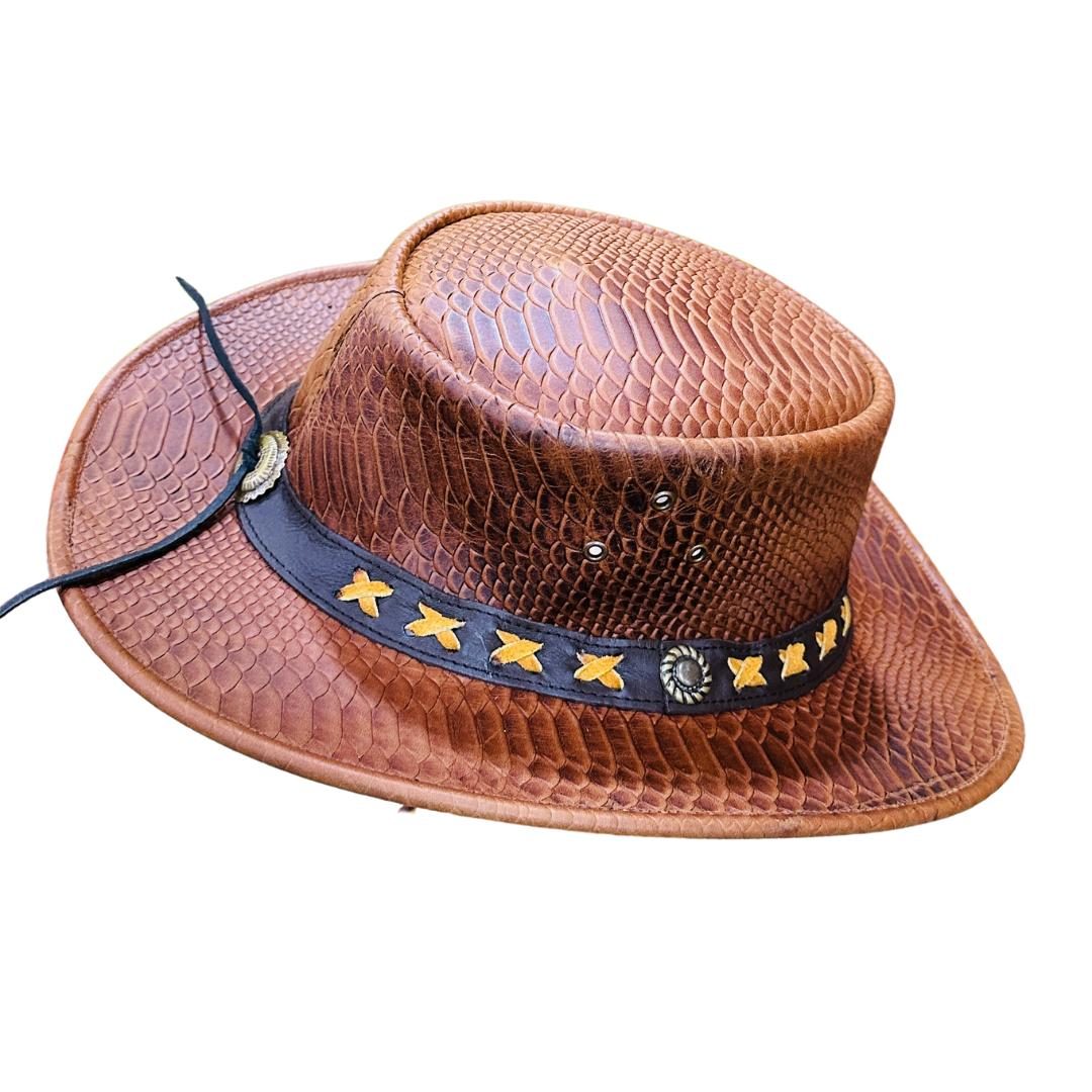 This captivating leather hat is a bold statement piece, embodying the fearless spirit of the frontier with a touch of exotic texture. Crafted for the adventurer and the style icon alike, its distinctive gator-embossed finish and rugged detailing make it a standout piece of traditional Western headwear.