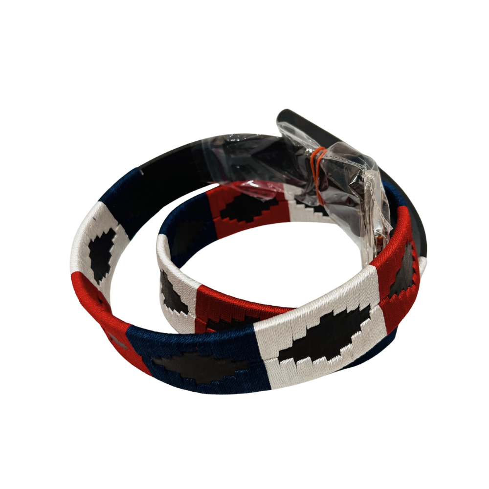 The belt has an elegant and stylish look from the intricate embroidered pattern in navy, red, and white threads, giving it a blend of sophistication and vibrant appeal. The detailed work required to create this patterned design showcases the expertise and creativity of the makers, adding a unique touch to any outfit.
