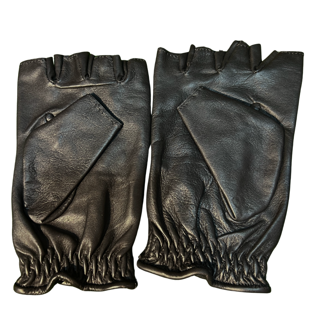 This traditional utility accessory is crafted from premium, durable black leather. The sturdy construction ensures a reliable look and feel, suitable for the motorcyclist, weightlifter, or enthusiast who requires total grip contact and ventilation. We meticulously craft this glove by skilled leather artisans who pay attention to each detail, ensuring a secure and protective fit across the palm and knuckles. From the choice of tough leather to the reinforced stitching and adjustable closure, the dedication and artistry of the craftsmen shine through in this functional leather glove.