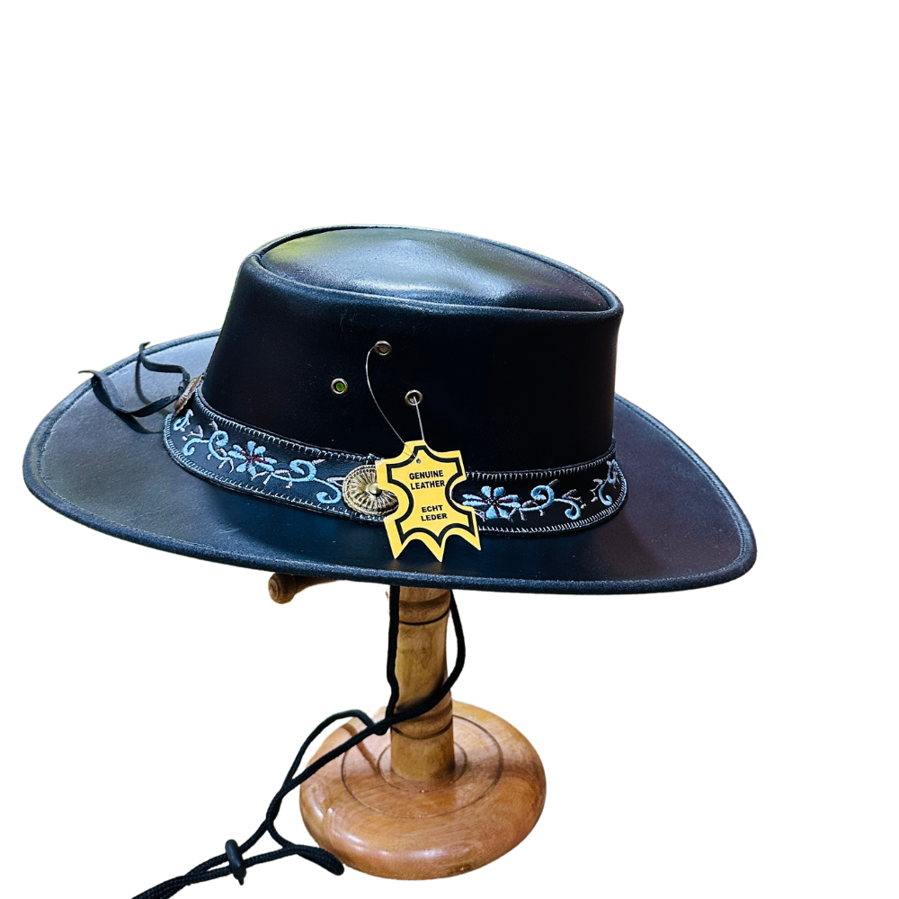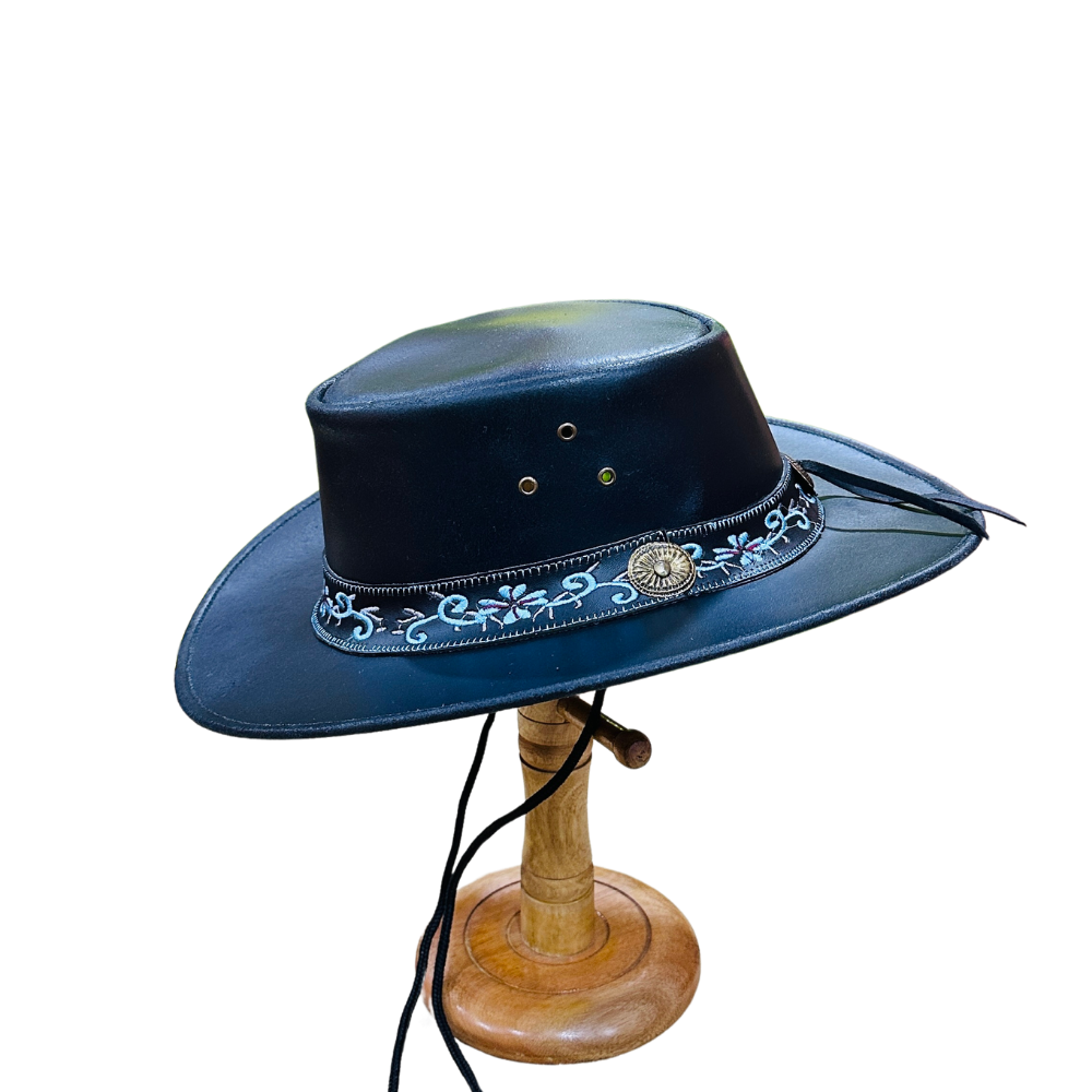 The hat achieves an elegant and stylish look from the intricately embroidered hatband around the crown, giving it a blend of sophistication and bold visual appeal. The embroidery features a striking floral pattern with vibrant blue and red accents, contrasting sharply with the black leather. The intricate work required to make an embroidered band showcases the expertise and creativity of hat makers, turning the hat into a wearable piece of art.