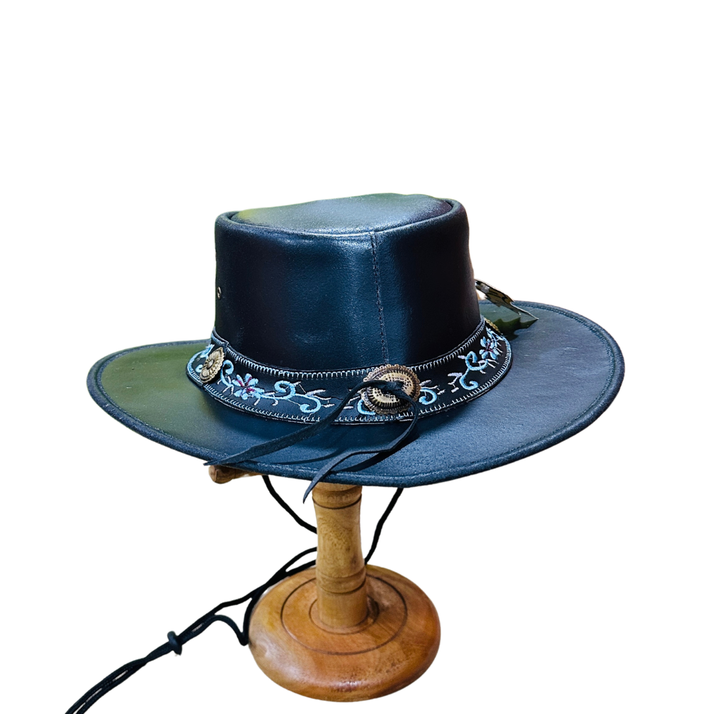 An authentic leather hat is a powerful symbol, recognizing the enduring appeal of traditional headwear. Western hats embody the spirit of the wild west and frontier style like nothing else. The sharp elegance of this hat is timeless, along with its unique embroidered style, wide brim, and distinctive crown shape, making it a luxurious leather hat for any occasion.