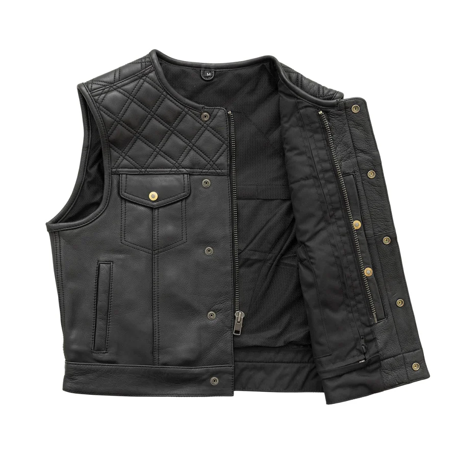The Shell Shock Men’s Motorcycle Leather Vest blends classic club styling with refined detailing and rider-focused functionality. Crafted from premium naked cowhide leather and built on a shortened riding pattern, this vest delivers a sharp fit, armor-ready protection, and standout design elements that make it a true statement piece on and off the bike.