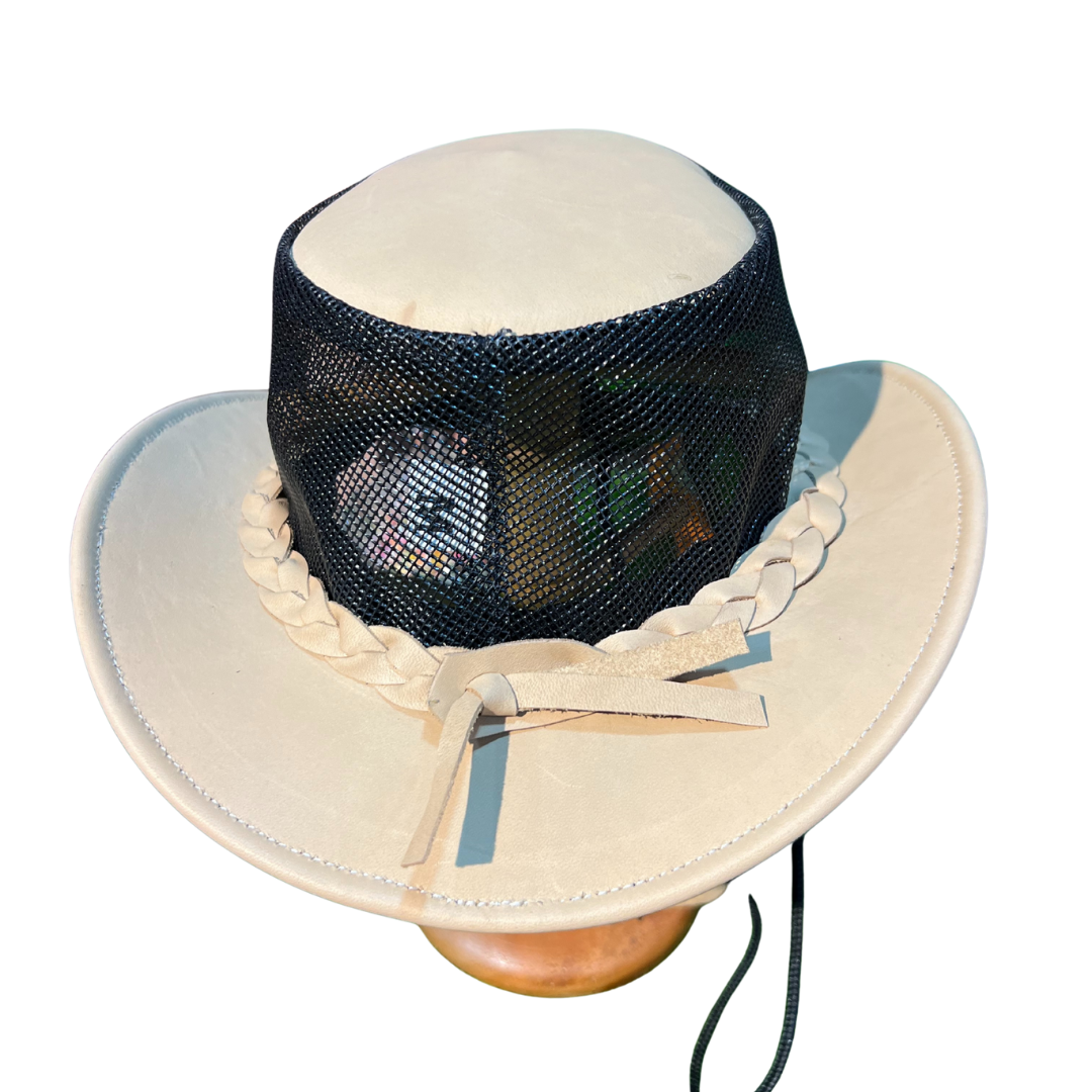 This functional hat doesn’t compromise on elegance. The wide, structured brim is crafted from premium suede or leather, offering durability and a luxurious feel. Encircling the base of the mesh crown is a stylish braided hatband made from the matching cream material, adding a touch of handcrafted texture and sophistication to the rugged design.