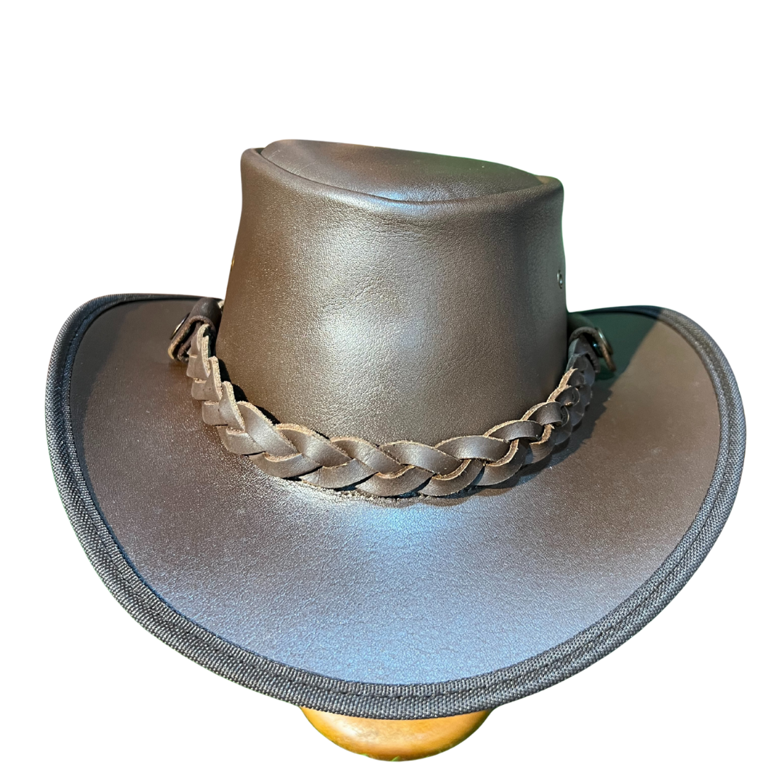 Hatband: Black Leather Strap with Brown Contrast Trim and Laced Tie