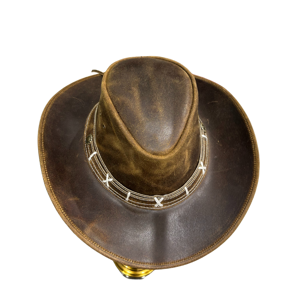 An authentic cowboy hat is popular headwear, and this model achieves powerful appeal through its use of premium waxed dark brown leather. The rich, deep tone provides a luxurious and established look, making this hat feel sturdy and elegant, suitable for both outdoor enthusiasts and refined casual wear.