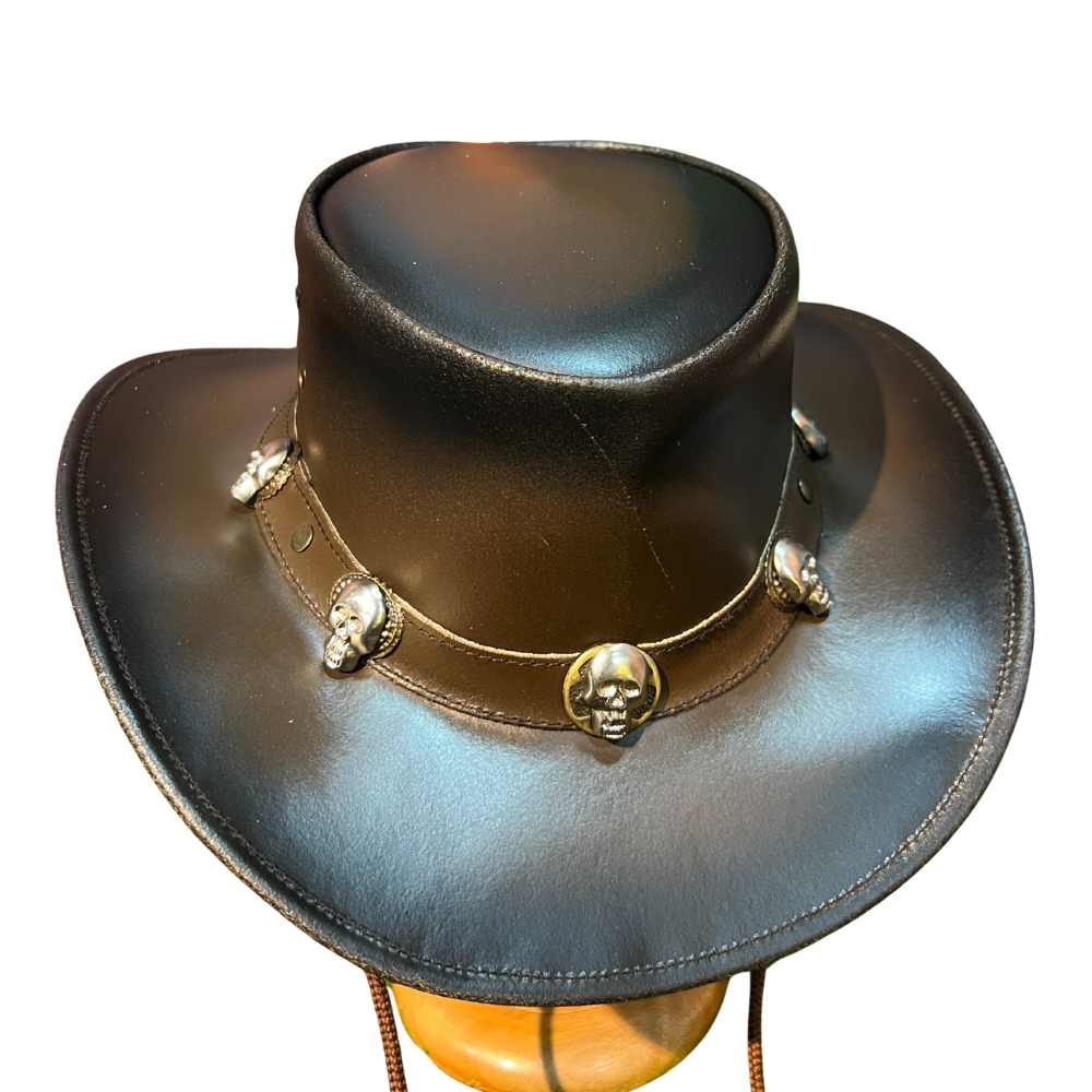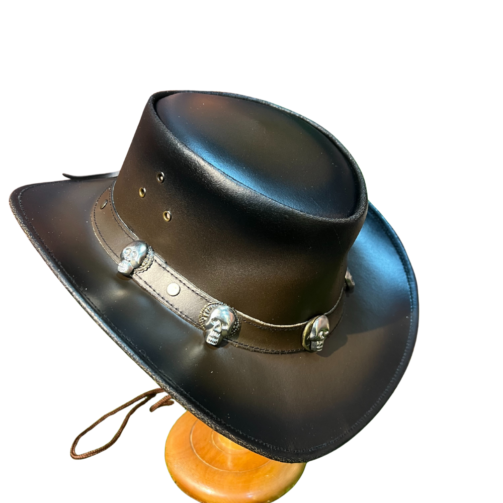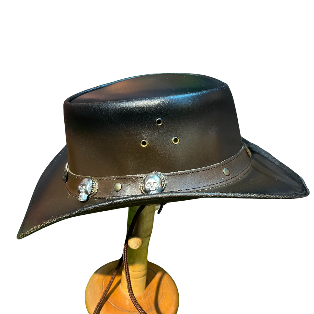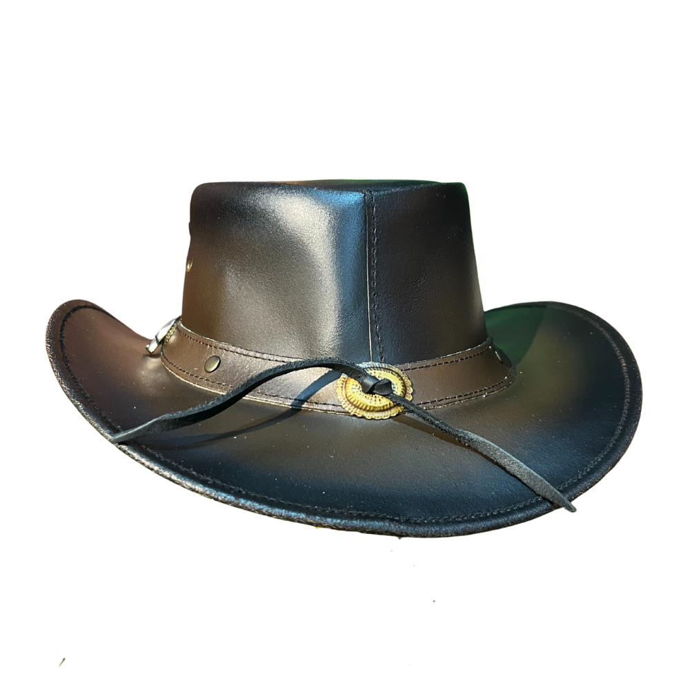This western headwear is meticulously handcrafted by skilled artisan hat makers. The robust black leather provides exceptional durability and structure, making this hat a superb choice for those who seek high-value, distinctive accessories built to withstand the elements.
