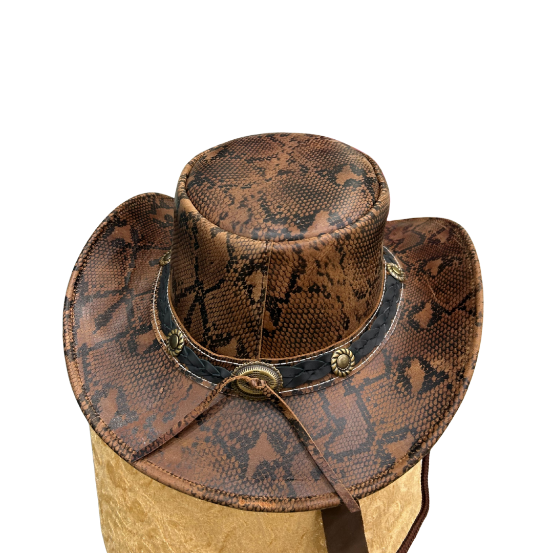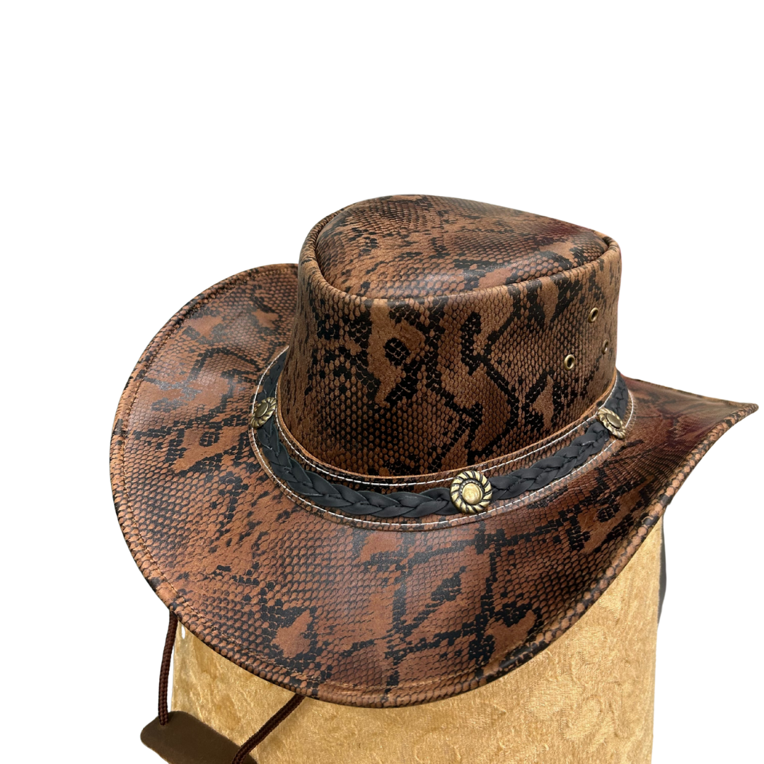 This striking hat is made of premium leather featuring a lifelike, embossed snakeskin pattern in rich brown and tan tones. This material provides a smooth and luxurious feel while showcasing an adventurous and unique style, suitable for outdoor travelers or adventure lovers. We handcraft this Western hat by skilled artisan hat makers who pay attention to each detail, ensuring the pattern is sharp and the structure is robust.