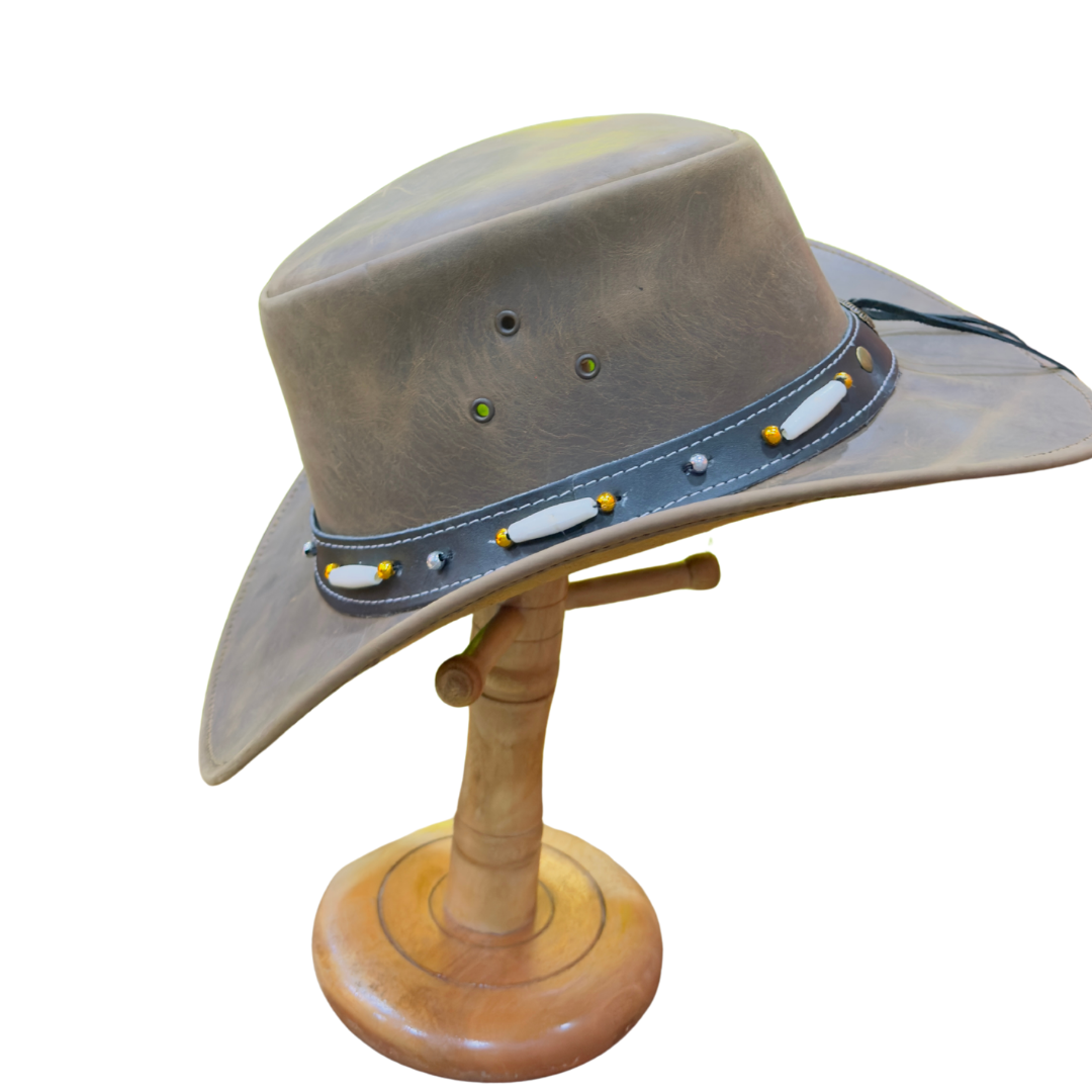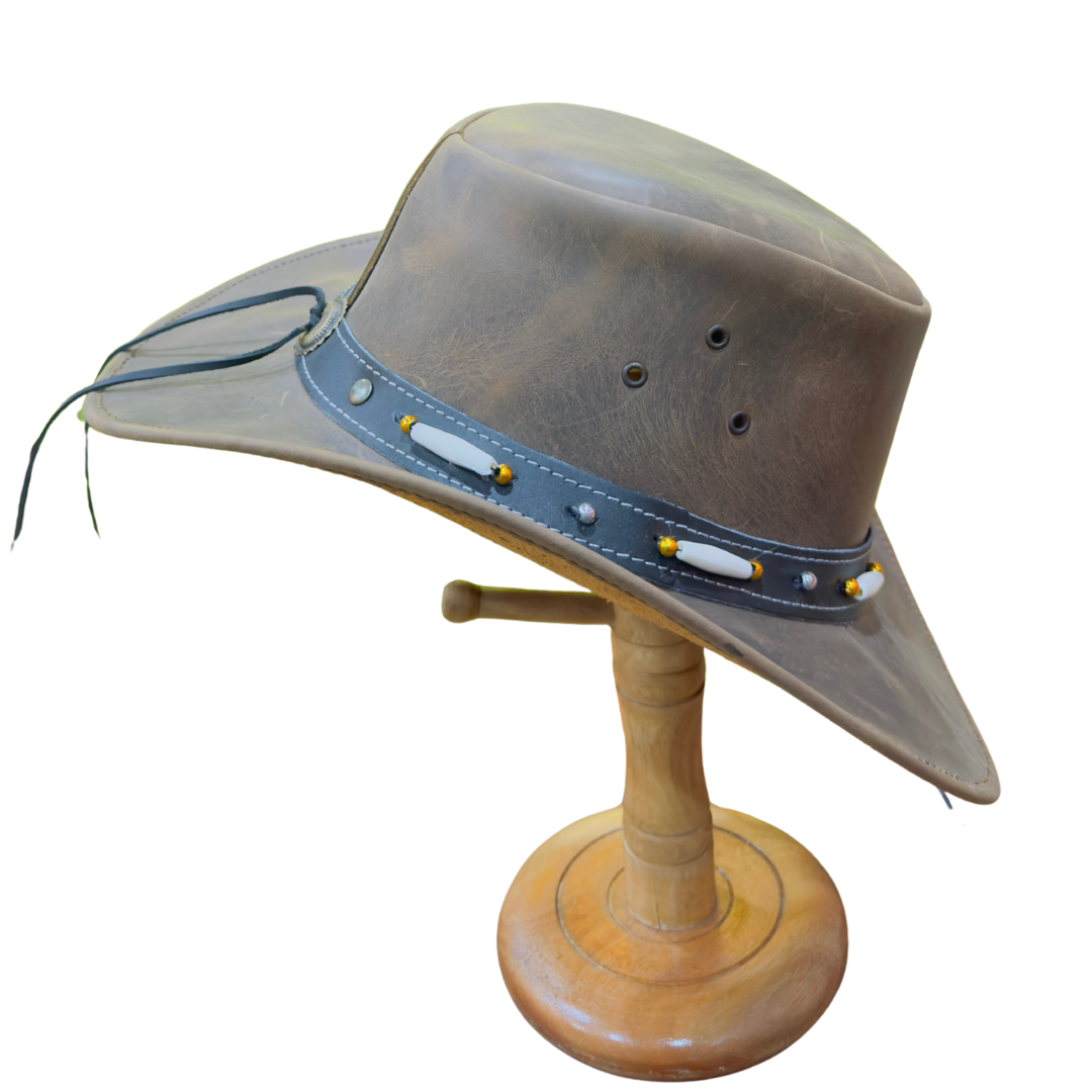 This striking hat is made of premium leather featuring a lifelike, embossed snakeskin pattern in rich brown and tan tones. This material provides a luxurious feel and a unique style, suitable for adventure lovers. Handcrafted by skilled artisans, the attention to detail ensures the pattern is sharp and the structure is robust.