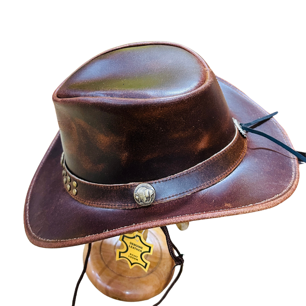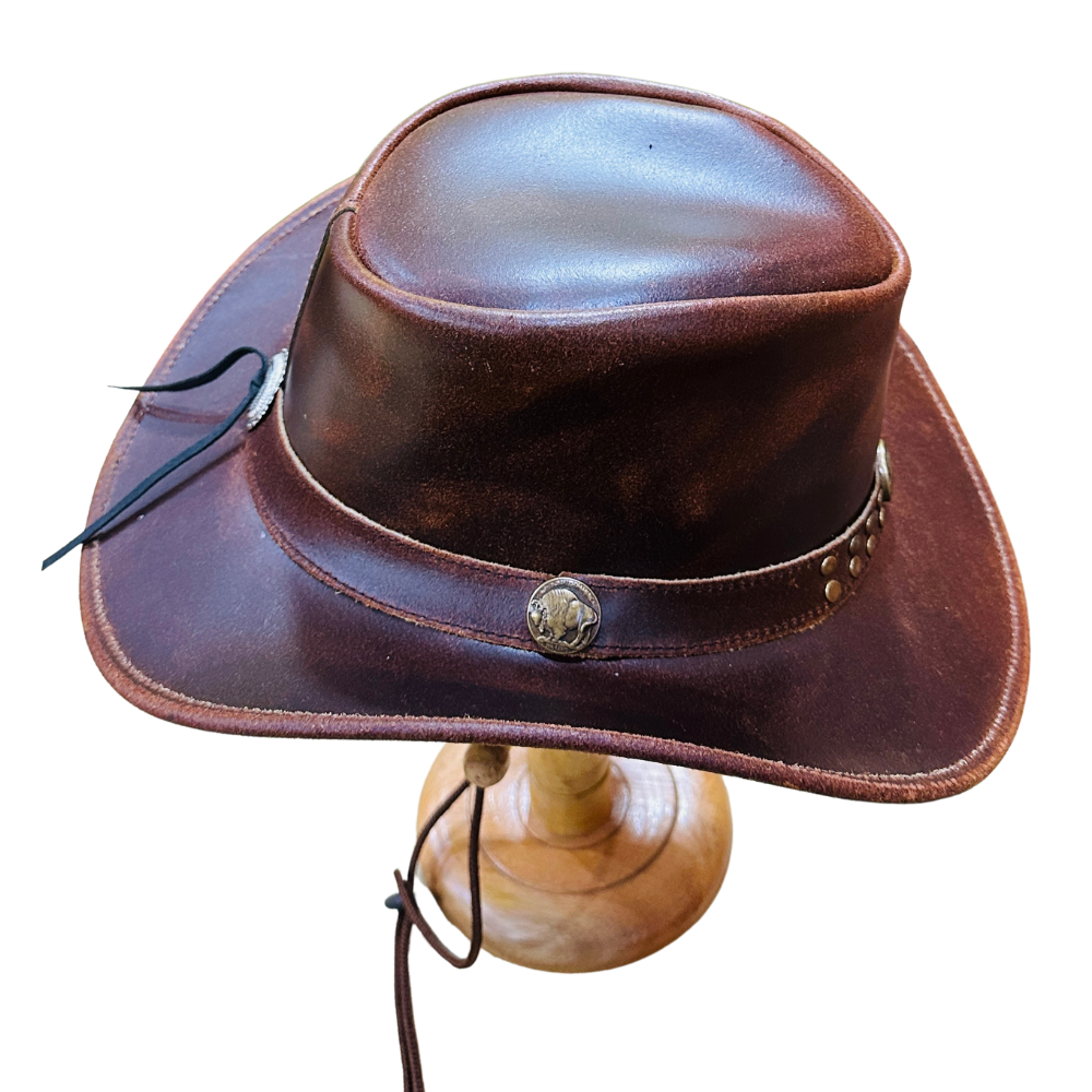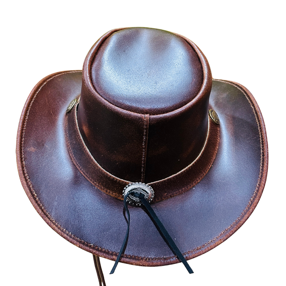 This authentic cowboy hat is a recognition of traditional American culture, capturing the timeless rugged elegance of the wild west. The rich distressed finish, contrasting braided lacing, and distinctive shape make it a popular and highly durable leather hat.