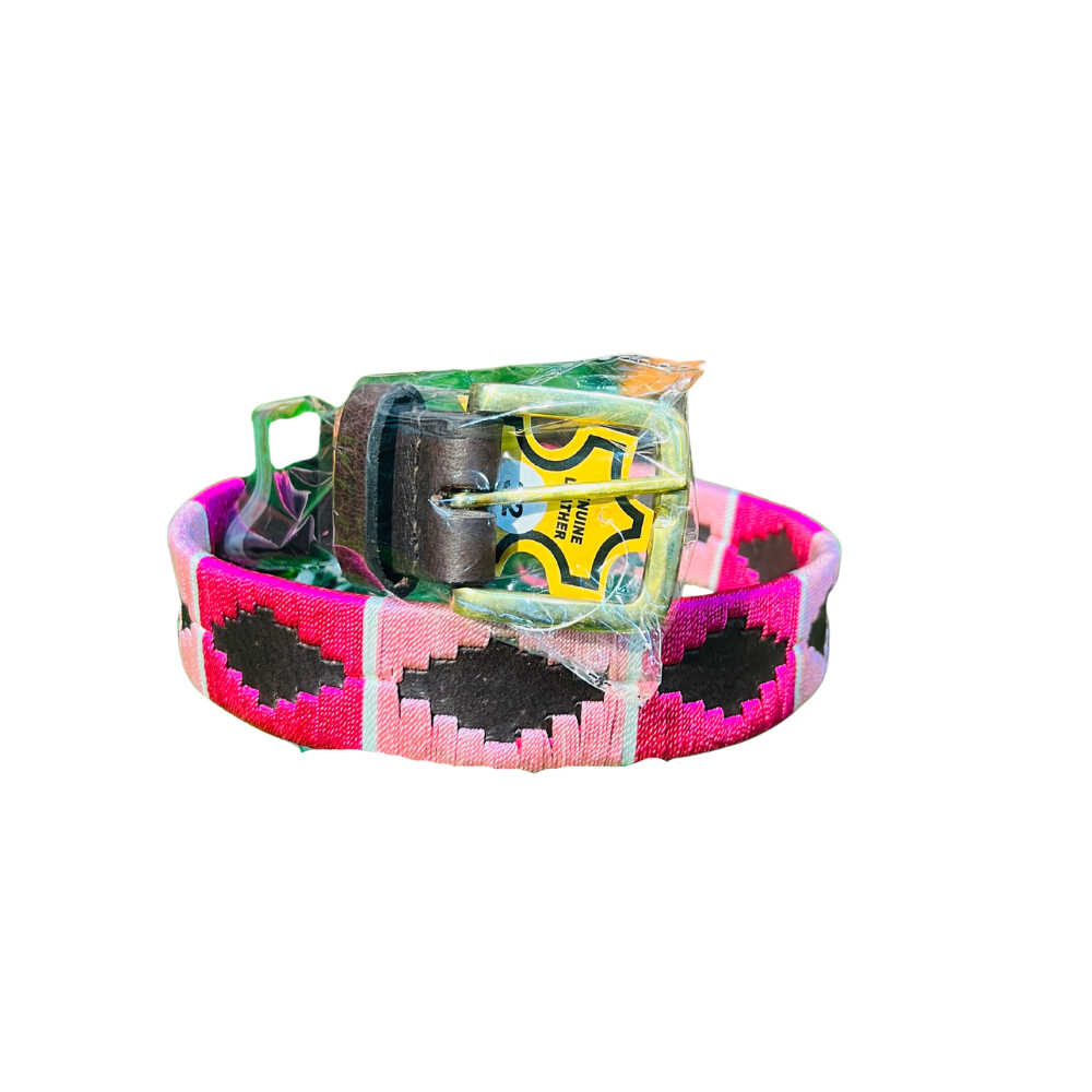 An authentic gaucho-style belt is a recognition of traditional South American culture as a popular accessory. These belts embody the vibrant spirit of the pampas like nothing else. The rugged elegance of this belt is timeless, along with its bright pink and black embroidered pattern, genuine leather accents, and classic gold-toned buckle, making it a distinctive and popular leather accessory.