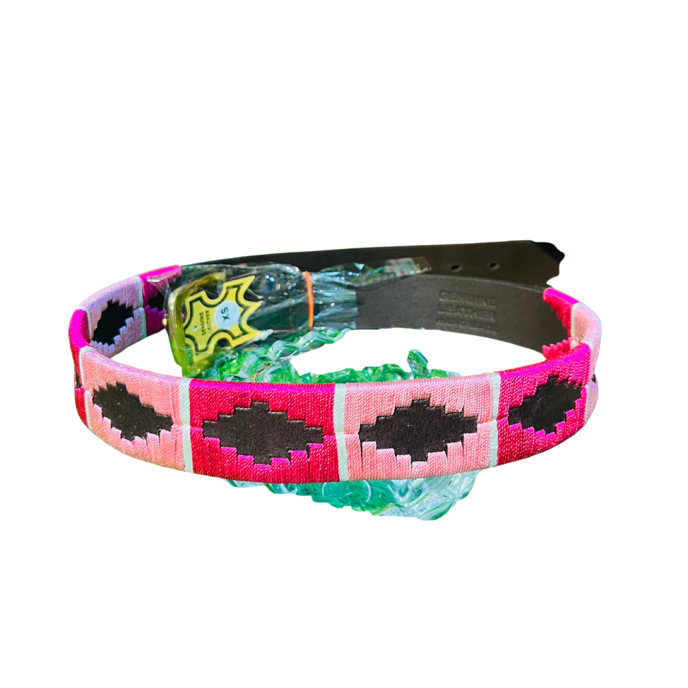 The belt features an elegant and stylish look from its intricate embroidered pattern, giving it a blend of sophistication and vibrant appeal. This Gaucho-Style design uses striking Pink, Red, and Black threads to create a bold, eye-catching accessory. The detailed work required to create this patterned design showcases the expertise and creativity of the makers, adding a unique, cultural touch to any outfit.